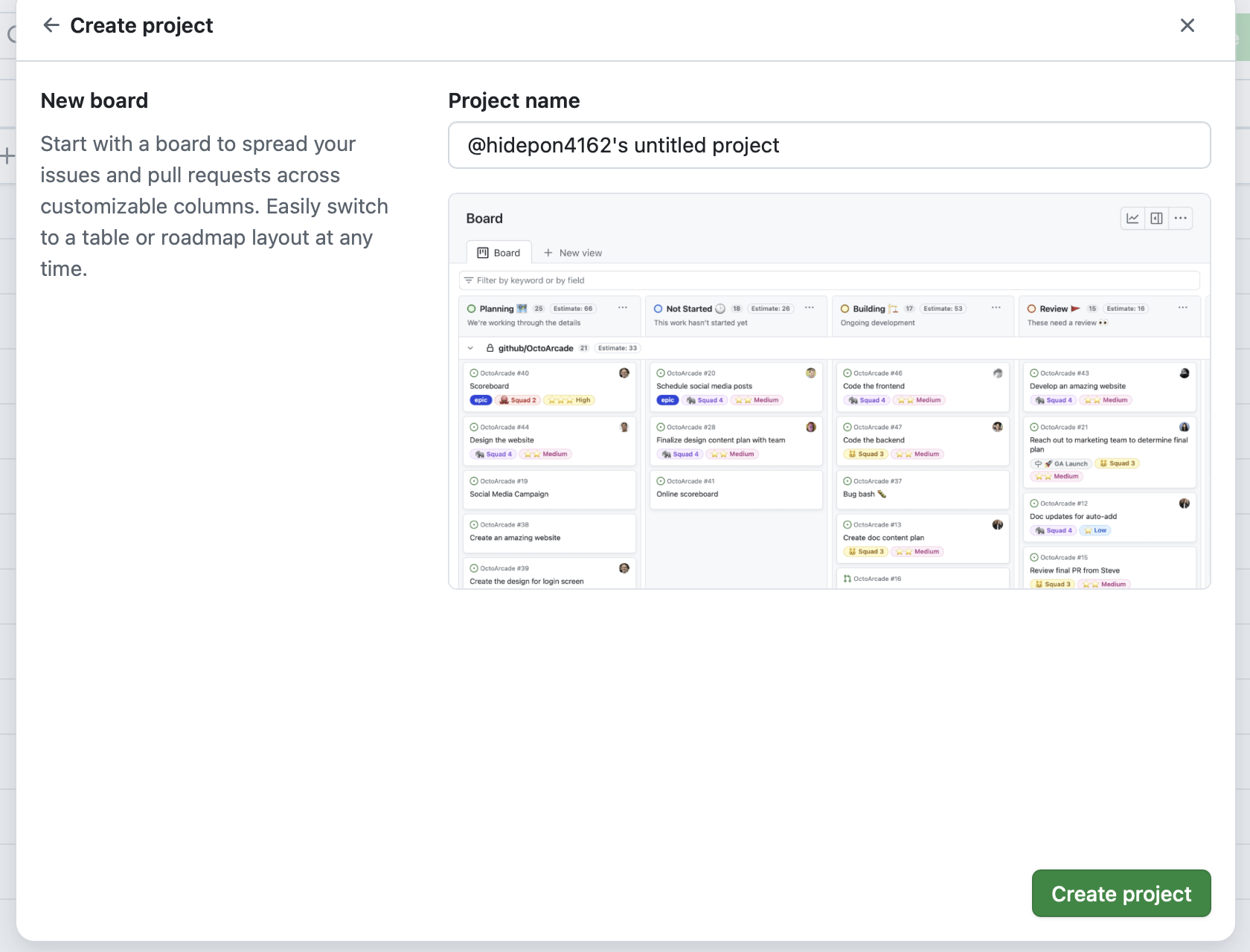 - 右上の Project name にプロジェクト名(例:「探すゲーム開発ボード」)を入力
