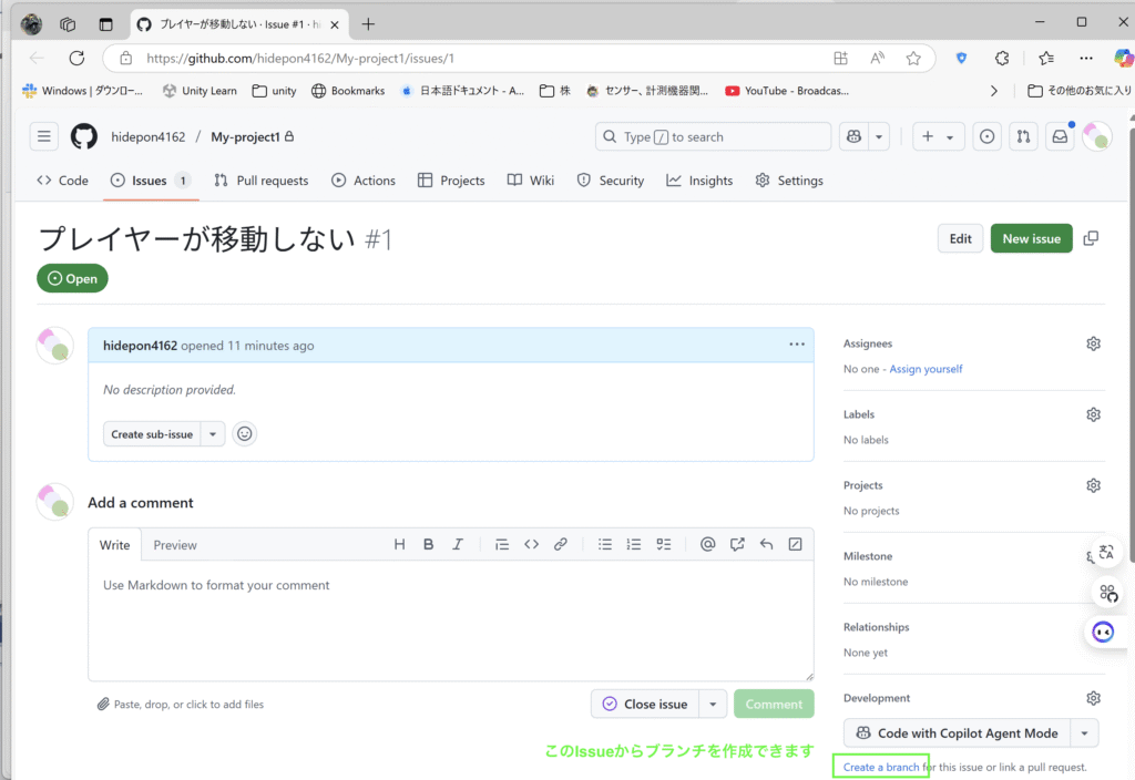 - 操作後、Issue画面右下に新規ブランチ名が表示されていることを確認します。