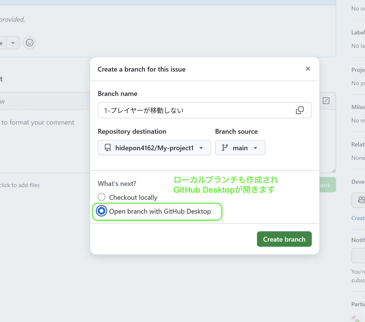 <リポジトリ名>/<Issue番号>-<Issueタイトル>という形式で、自動的にブランチが作成されます。 - ダイアログが表示され、「Checkout locally」または「Open branch with GitHub Desktop」を選択できます。