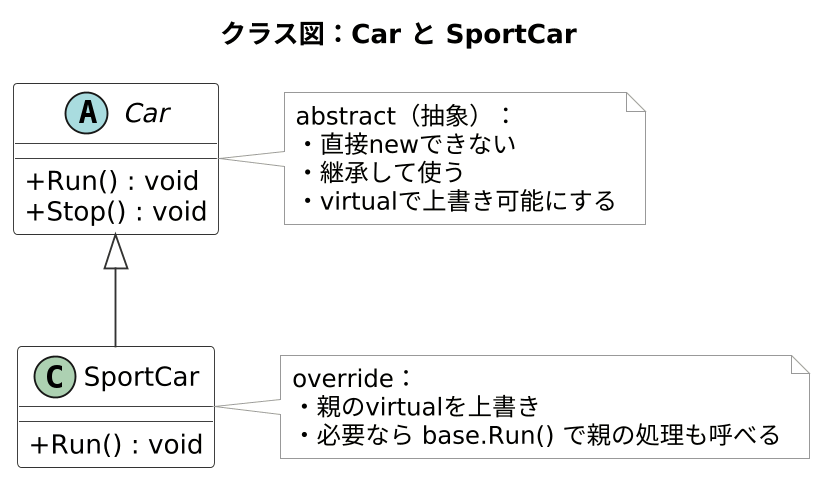 - Truck : Car を追加し、Run() を override。base.Run() を呼ぶ版/呼ばない版を比較。