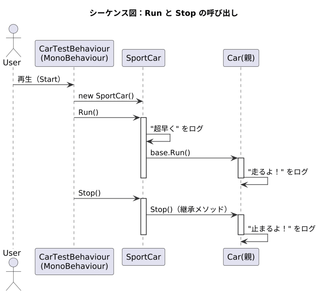 sportCar.Stop(); // 「止まるよ!」と出力される
