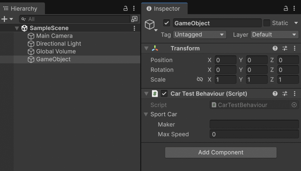 上記コードを CarTestBehaviour にアタッチすると、インスペクターに以下が表示されます: