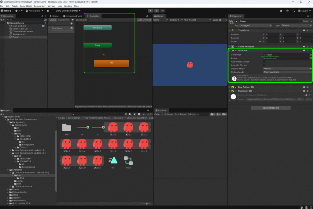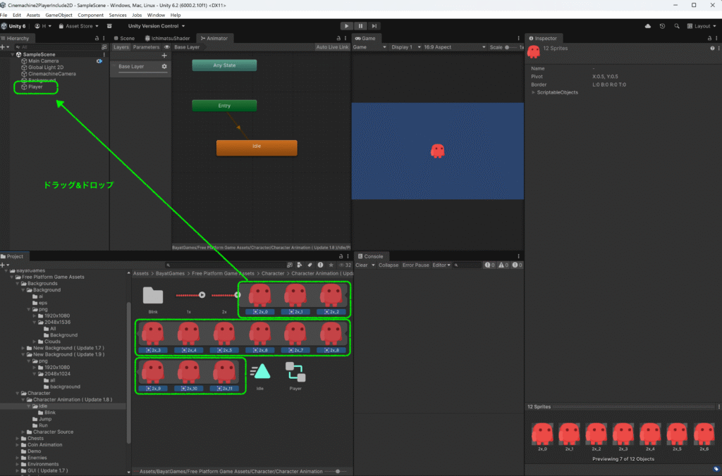 本記事では Unity 6(6000系)を前提に、1枚のスプライトシート画像からスプライトを切り出し、アニメーションを作成して再生する方法を解説します。