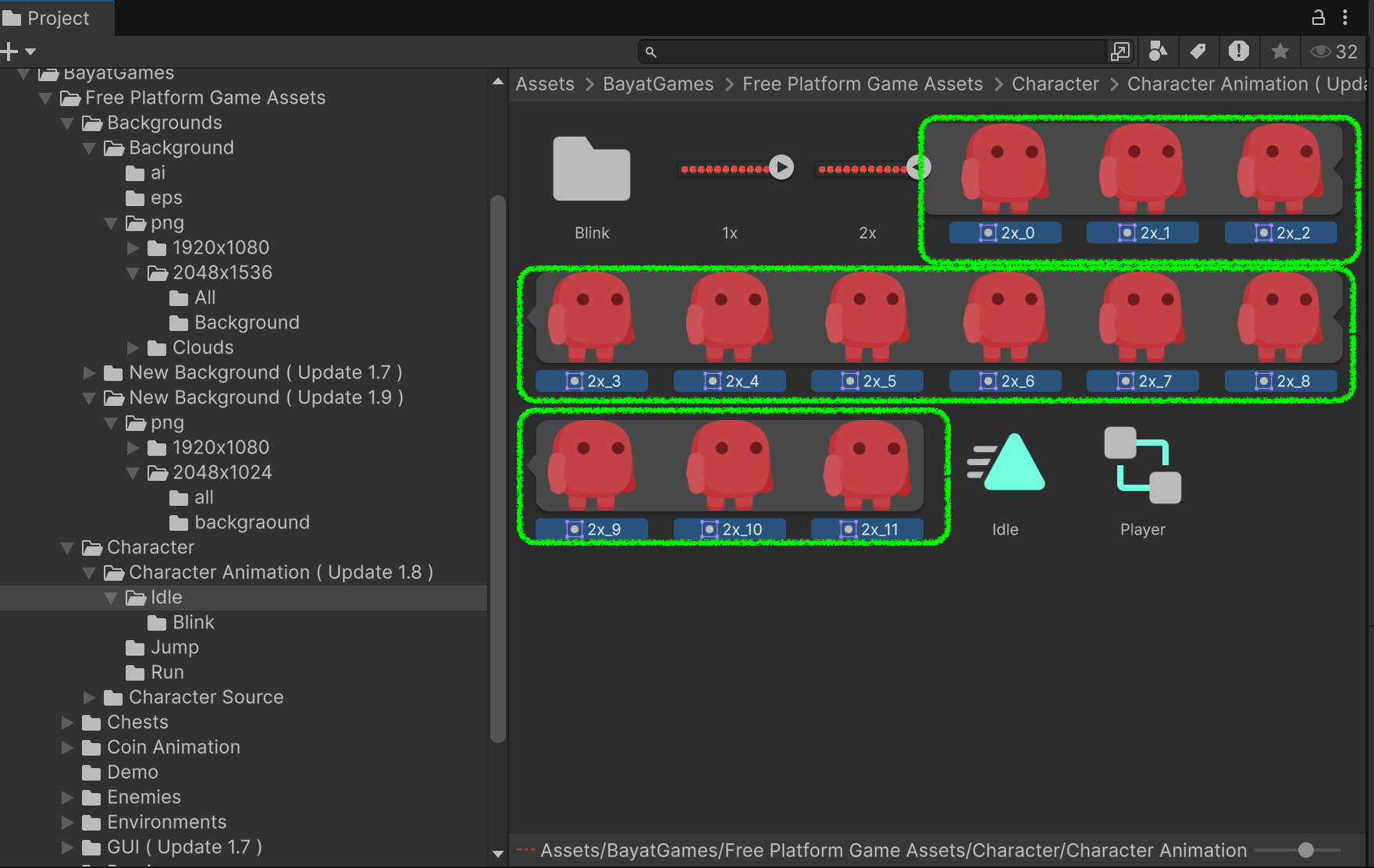 - Project ビューで、切り出された複数スプライトを 順番に選択