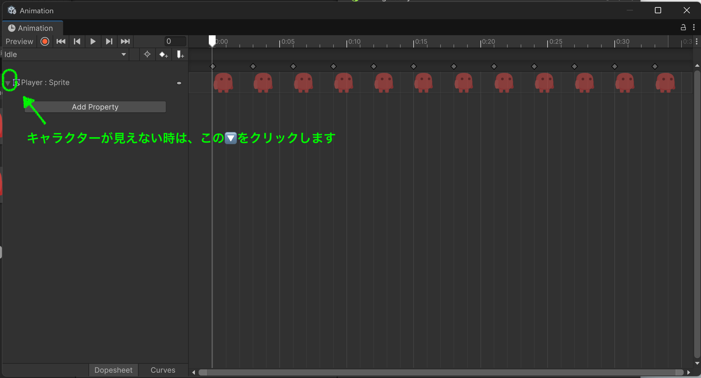 もう一つのタブ “Curves” ではプロパティをカーブで制御できる。Sprite アニメでは基本 DopeSheet を使う。