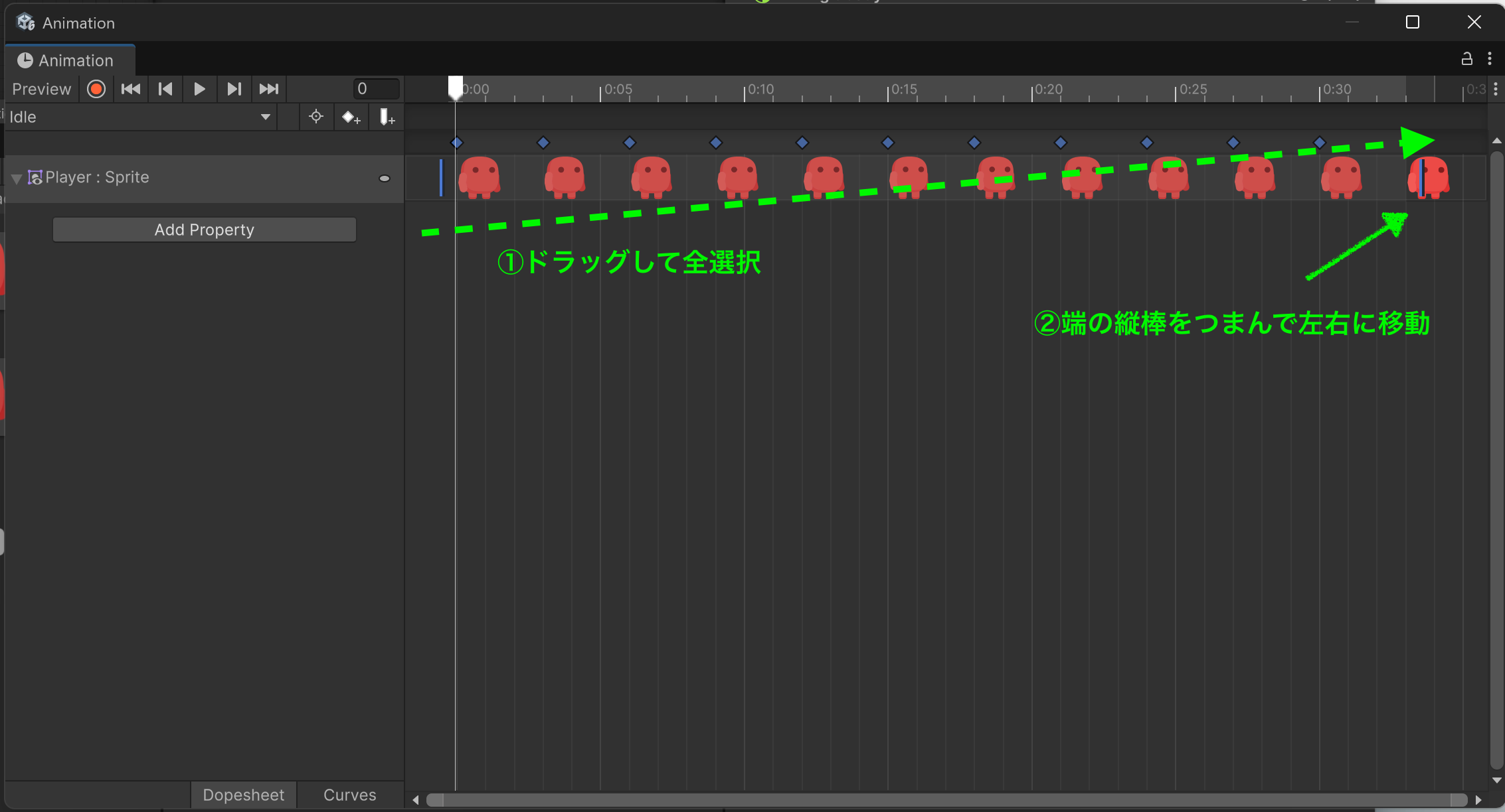 - Animation ウィンドウ下部 → 「Dope Sheet」タブ をクリック