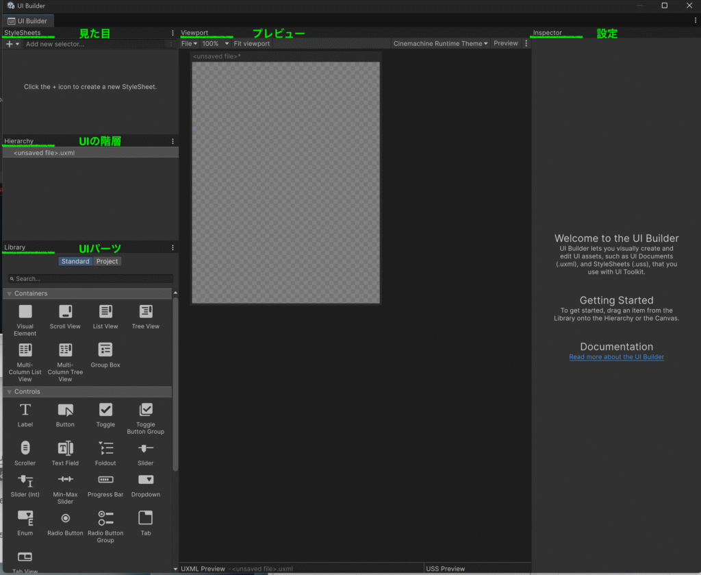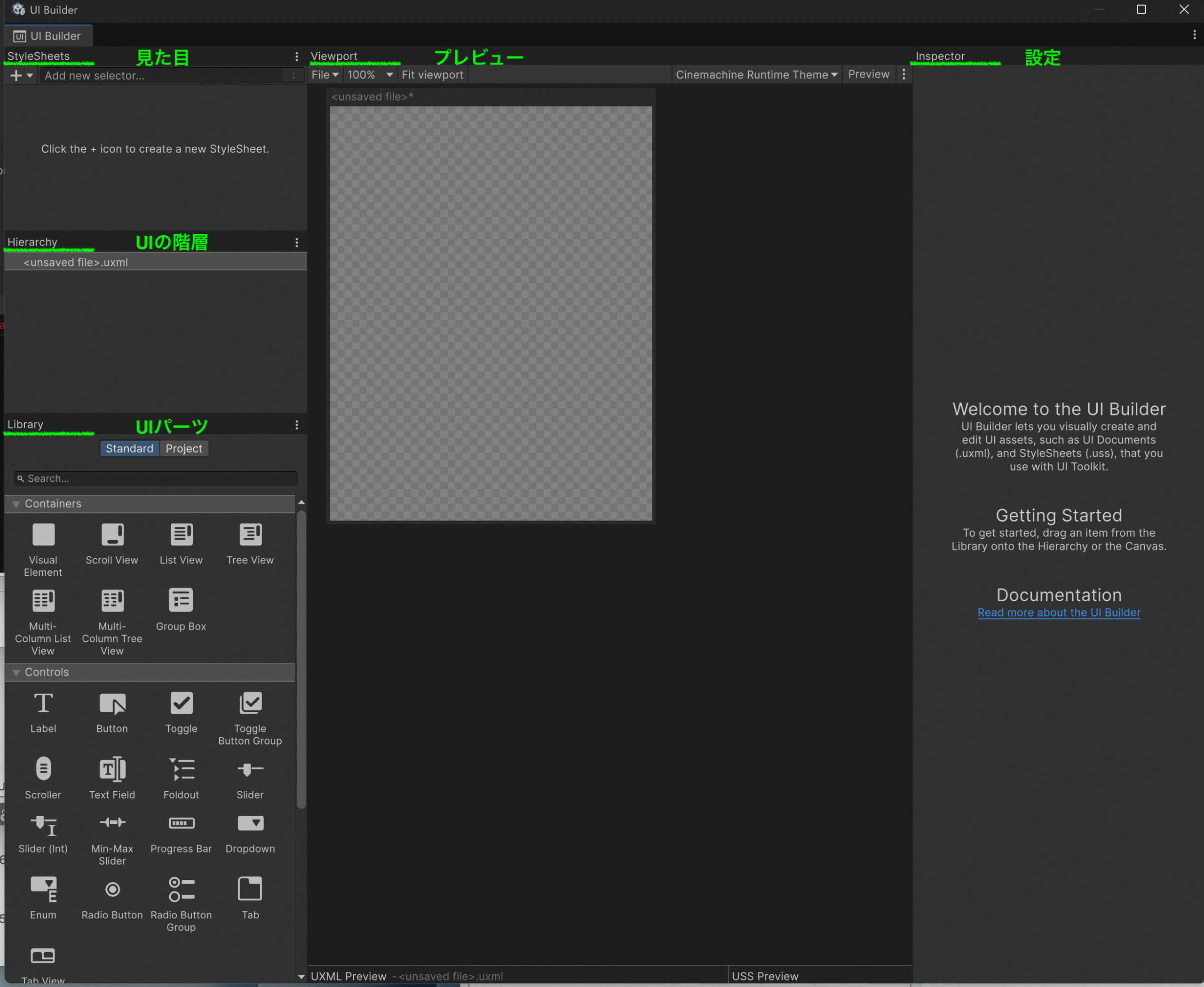 さらに、Unity には UI Toolkit 専用のエディタUI Builder(ユーアイ・ビルダー) が標準搭載され、UI を コードを書かずに視覚的に作成 することが可能になりました。