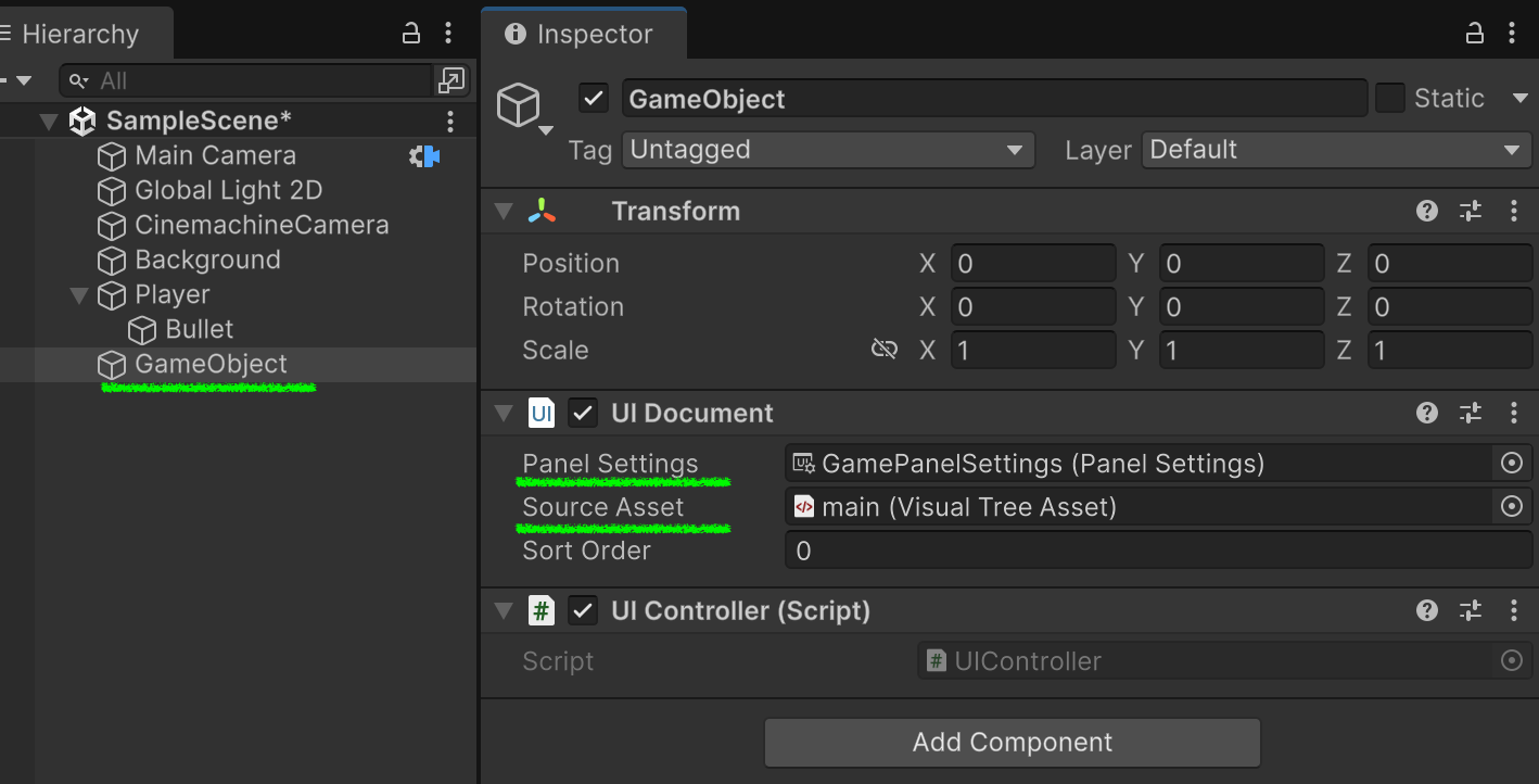 Create → UI Toolkit → Panel Settings Asset - できたアセットにGamePanelSettingsと名前をつける