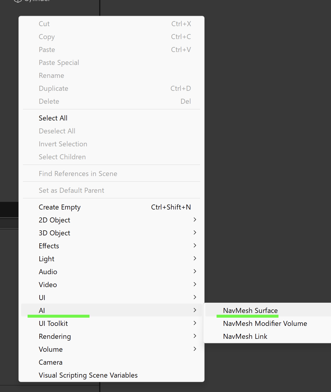 - Hierarchy で右クリック → AI → NavMesh Surface を選択