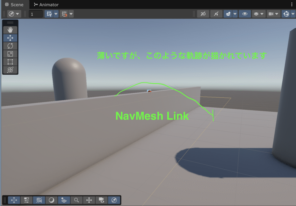 通常、OffMeshLink は “点から点” の移動ですが、今回は 柵の長さ全体で飛び越えられるようにしたいため、