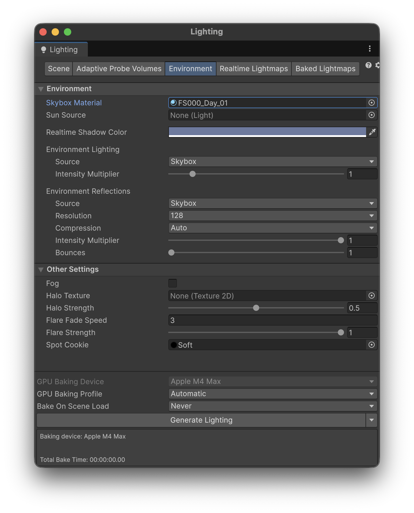 - Skybox Material に Fantasy Skybox のマテリアルを指定(例:FS000_Day_01)