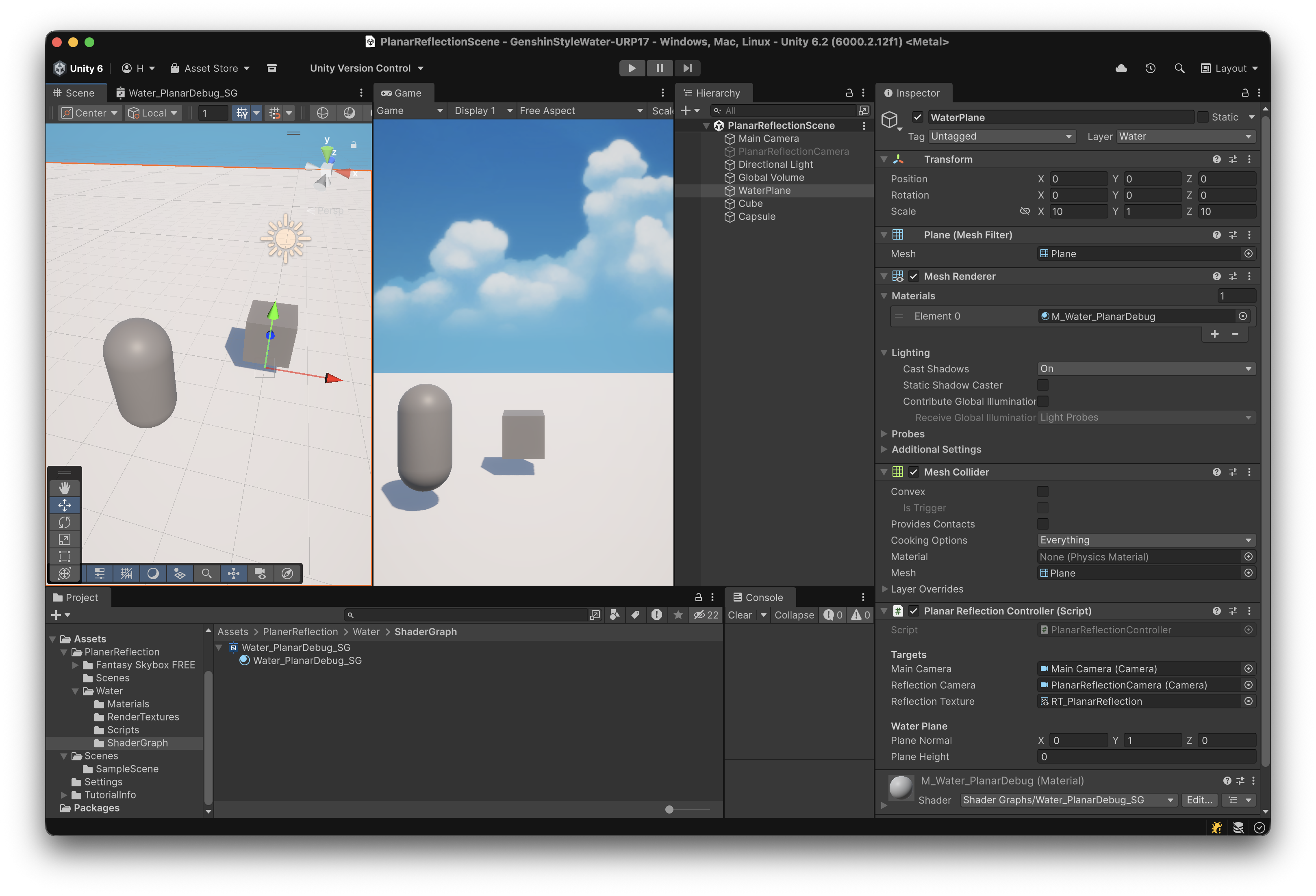- 水面に 空(Skybox)と Cube/Capsule が上下反転で映る