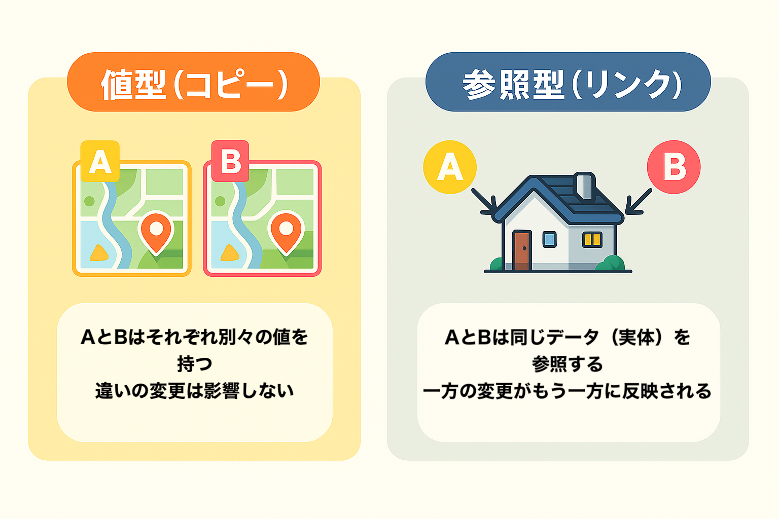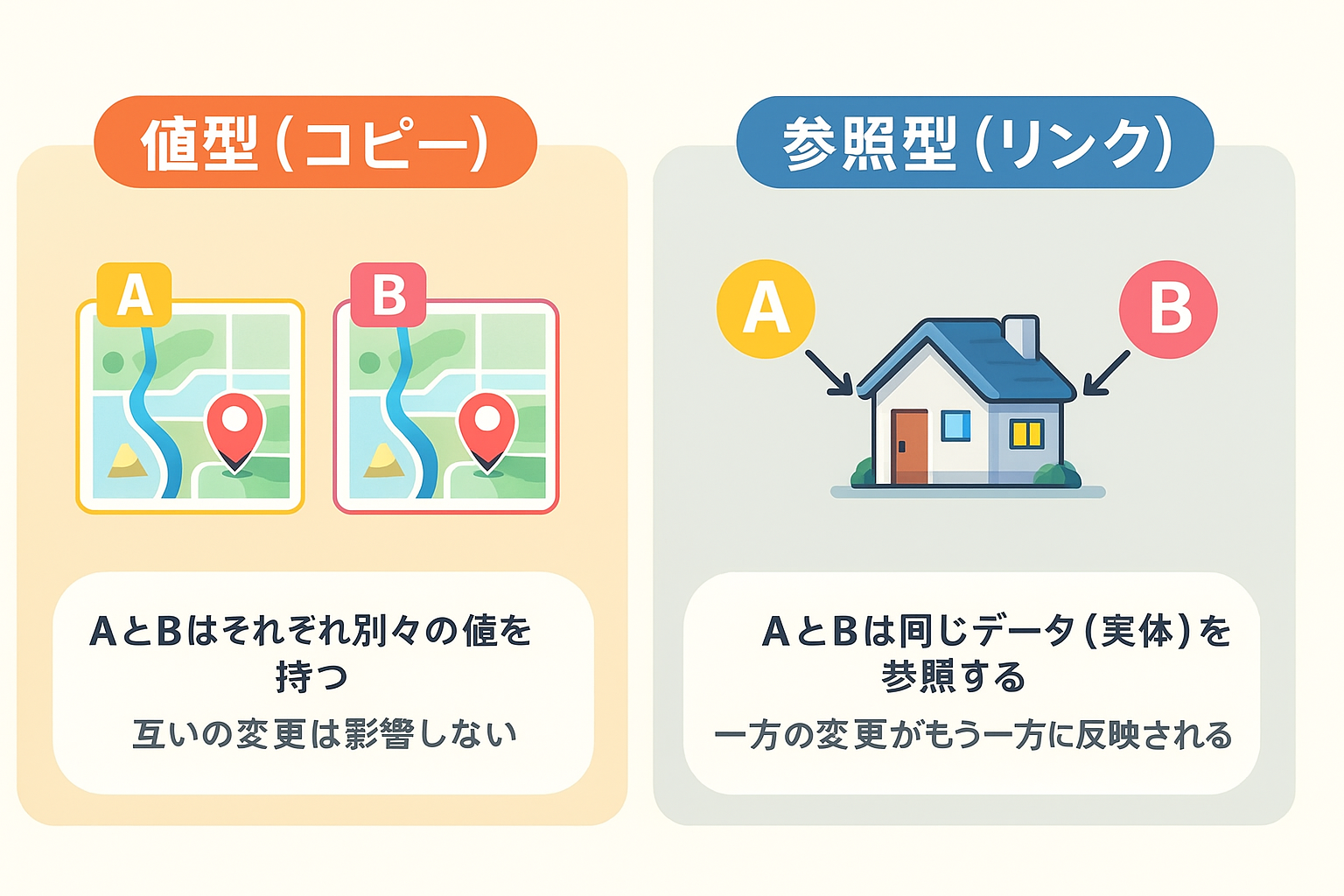 | 参照型(Reference Type) | 実体がある場所の 住所(リンク) | 同じ実体を共有。変更が全員に伝わる |