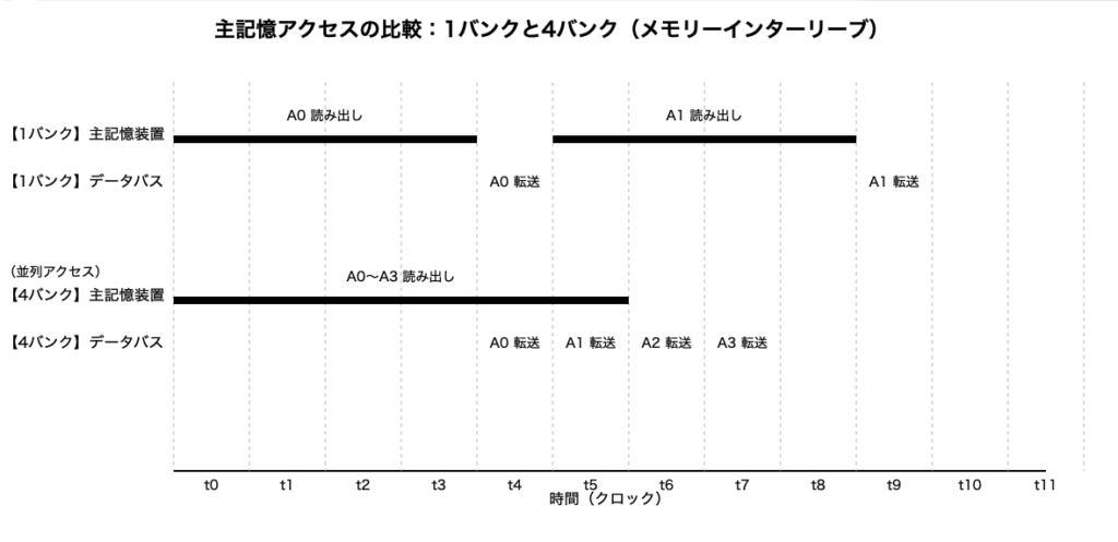 - 4バンク構成(メモリーインターリーブ)→ 複数バンクに並列アクセスでき、待ち時間が少ない