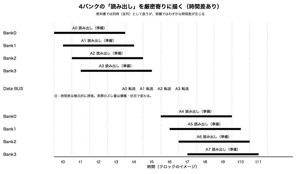 - 厳密には4バンクの A0〜A3 の読み出しは完全な同時開始ではなく、わずかな時間差があります。