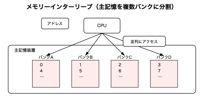 - 各バンクに並列にアクセスすることで待ち時間を減らす