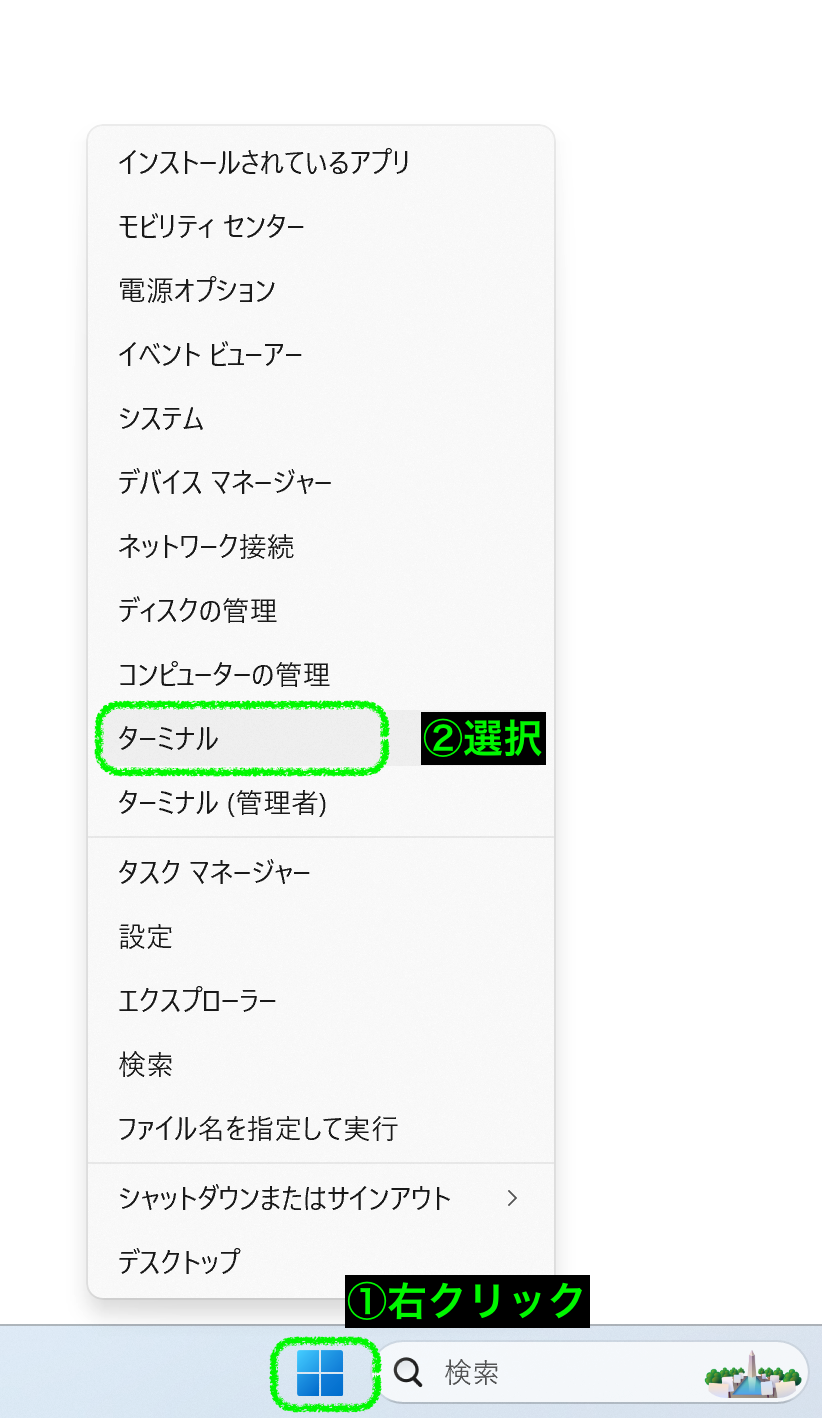 - 「ターミナル」 を選択(※「コマンドプロンプト」でも同じ)