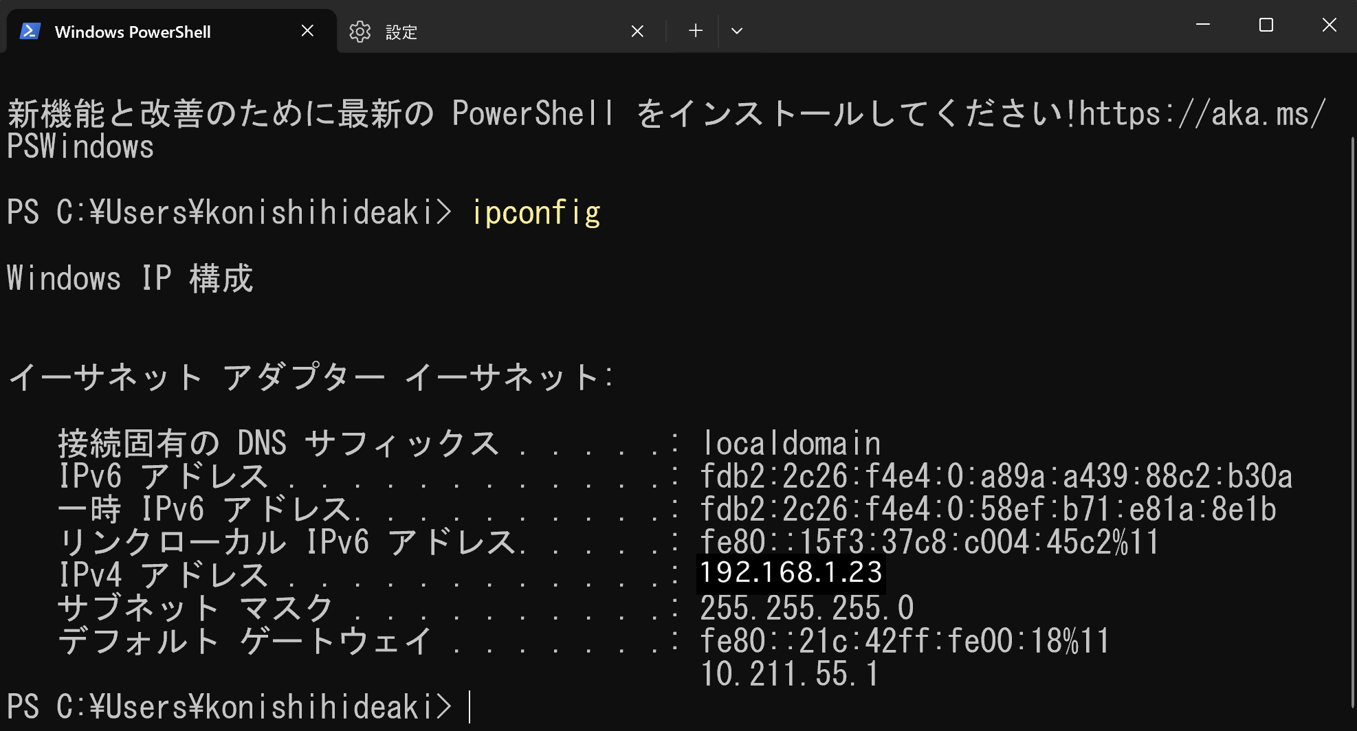 IPv4 アドレス . . . . . . . . . . : 192.168.1.23